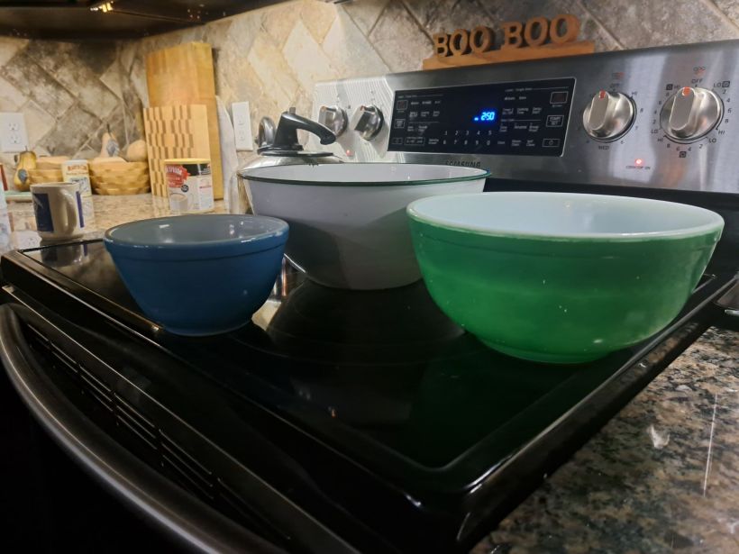 These mixing bowls are something dear to me. The green and teal ones are all that is left of my mother’s mixing bowl set. I remember her using the full set of four. Social media tells me they are now valuable, something many of the younger generation consider desirable.